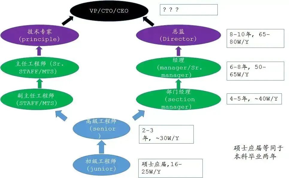未来的发展,基本按照上图的发展阶梯来走,一些人会一直做技术,成为一名资深验证工程师,有些人会成为验证经理,做一些管理类的工作。好消息是大部分人只要一直做下去都能成为一名资深工程师(STAFF级别)或者经理,坏消息是只有极少数人能成为技术专家或者总监这个级别。