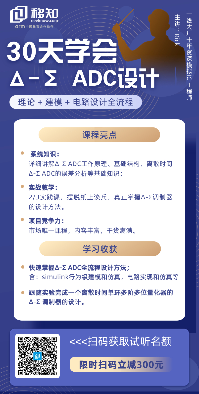 全新上线《30天学会Sigma-Delta(Σ-Δ) ADC设计》内容丰富,不仅包含Δ-Σ调制器工作原理、Δ-Σ调制器基础结构、离散时间Δ-Σ调制器的误差分析等基础理论的讲解,还结合实践手把手带领学生进行Δ-Σ调制器的自动化设计、行为级建模和仿真、以及电路的实现与仿真。摆脱枯燥的纯理论讲解,摆脱纸上谈兵,从理论到实践,彻底掌握Δ-Σ ADC的设计方法。