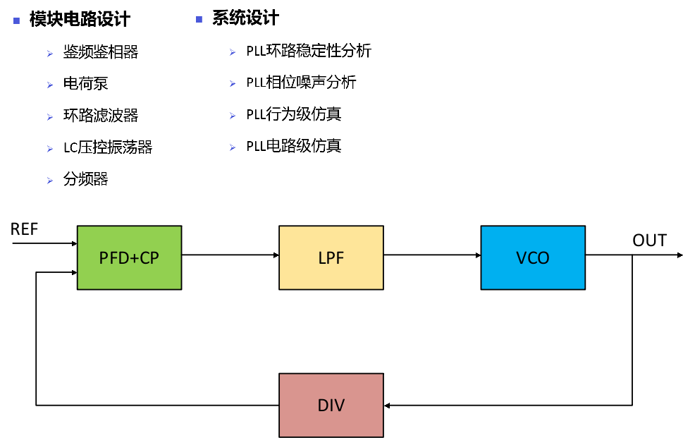 实战项目围绕PLL系统进行,包括模块电路设计与系统设计两大类。模块电路设计部分使用Cadence Virtuoso建立各模块的电路图并进行仿真验证。系统设计部分将使用Virtuoso,Matlab等工具对PLL系统作整体的仿真。