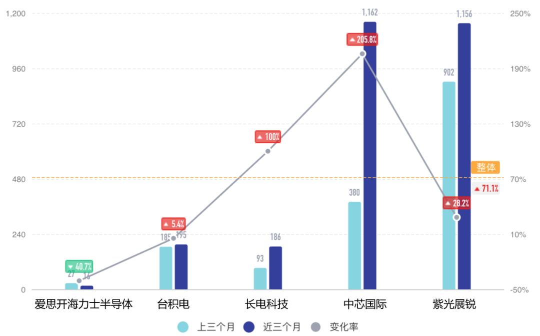 根据公开数据统计结果显示,4家企业的招聘需求均有上升,1家企业招聘需求下降,整体招聘需求上升71.1%。其中,中芯国际涨幅最大,上涨205.8%;爱思开海力士半导体需求降幅最大,下降40.7%。