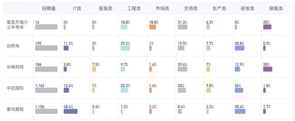 在半导体行业的各个职能中,信息工程、研发、支持类岗位的招聘量比重最高。
