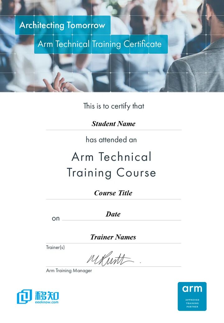 所有ARM系列课,均获得ARM专业资质评估;学员可通过系列课学习,完成学习,并通过测试考核,可获得ARM技术培训认证证书。