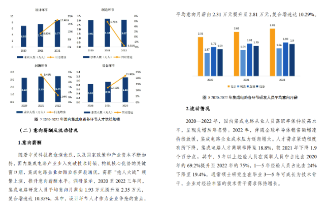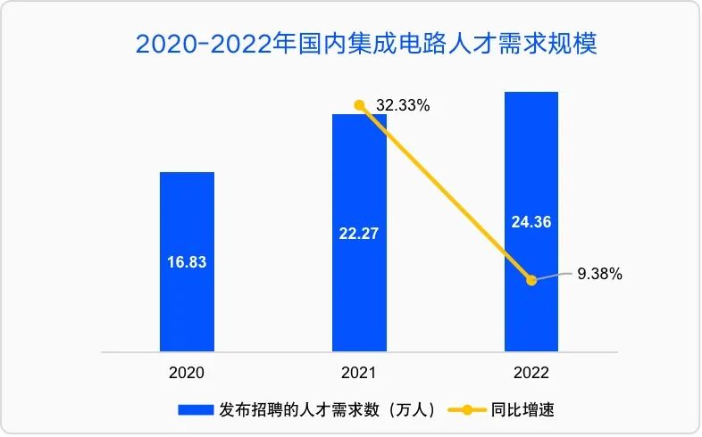 虽然行业开始降温,总体人才供给依然处于不足状态。从统计测算2022年国内集成电路从业人员约69.2万人,现存集成电路企业实际人才需求数约19.93万人,人才供给16.43万人,存在约3.5万人的需求缺口。