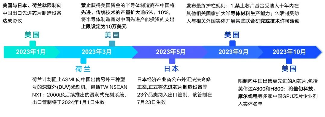 2023年,以美国为主导的集成电路技术封锁进一步升级,荷兰将禁止向中国出口14nm及以下的DUV光刻机,日本将包括EUV在内的清洗、薄膜沉积、热处理、曝光、刻蚀、检测等23个种类半导体设备纳入出口管制清单