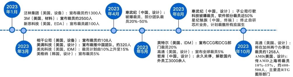 2023年,集成电路企业裁员潮愈演愈烈,已有英特尔、高通、格芯、寒武纪等超过10家国内外大厂启动裁员计划。其中,美国集成电路企业裁员较多,涉及EDA、设计、材料、设备、制造等多个环节,国内裁员企业集中在设计环节。