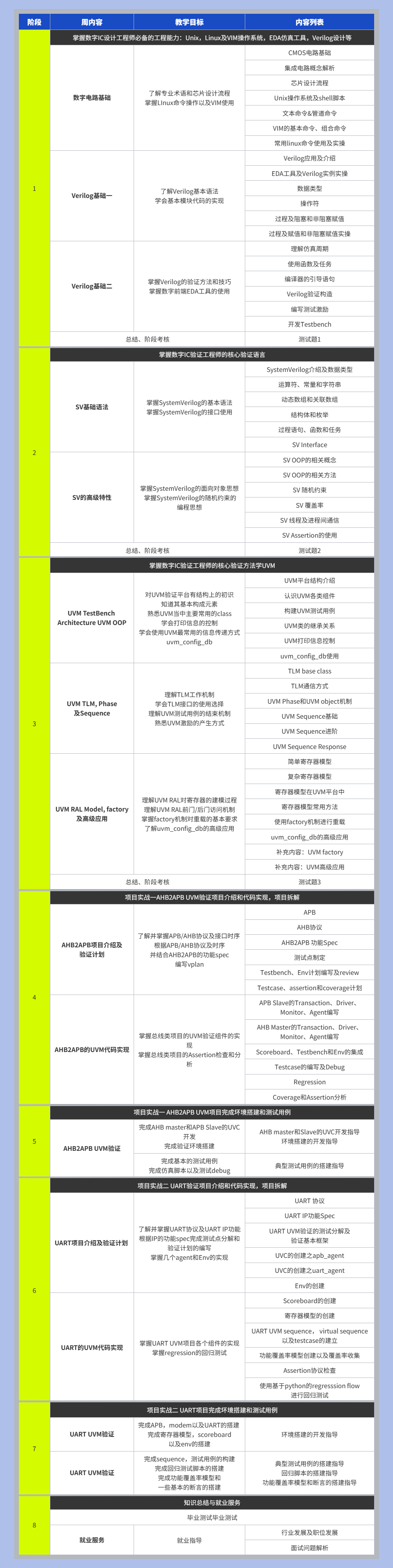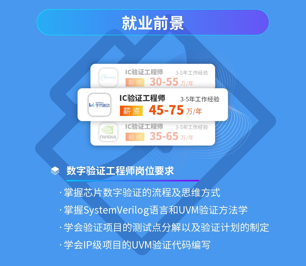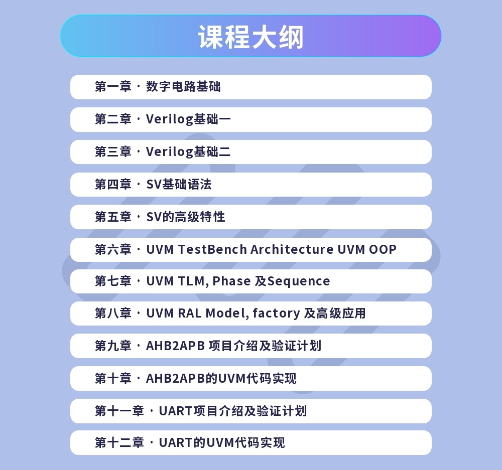 针对基础薄弱的学生以及转行工程师,学习完此课程后,能基本胜任公司对芯片数字验证工程师的要求。