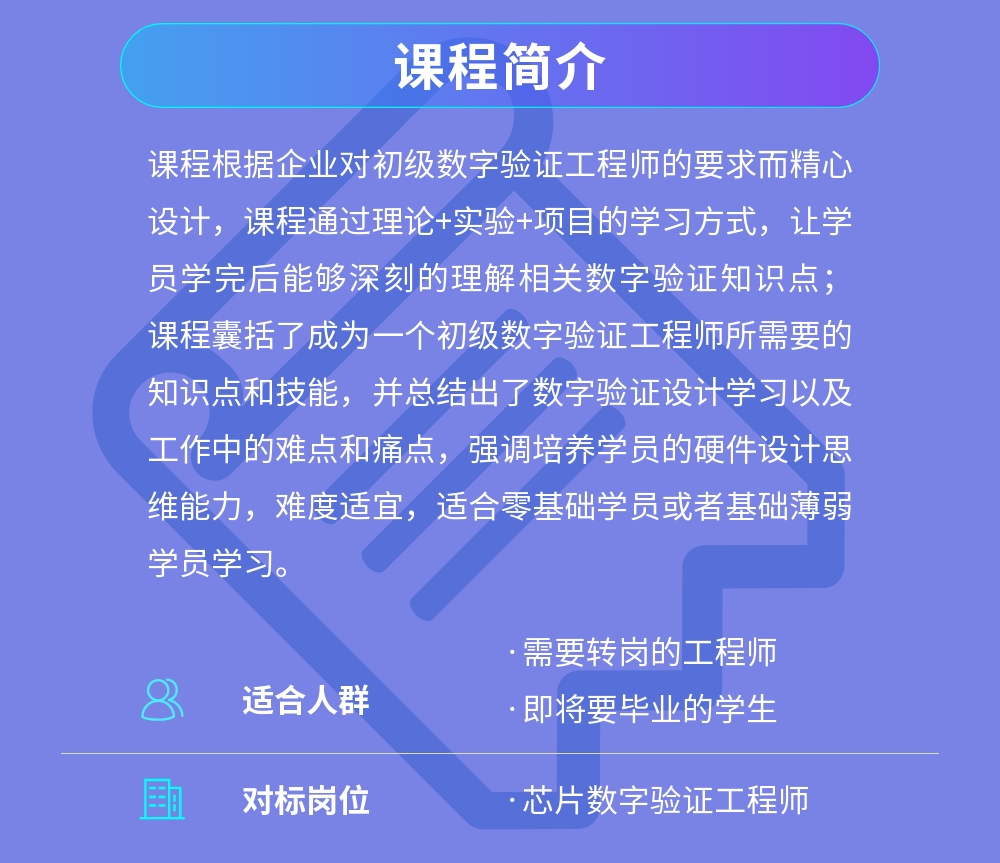针对基础薄弱的学生以及转行工程师,学习完此课程后,能基本胜任公司对芯片数字验证工程师的要求。
